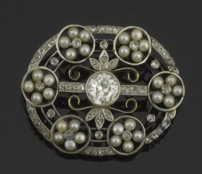 A diamond and seed pearl brooch. Centred with a circular cut diamond within a foliate design set...