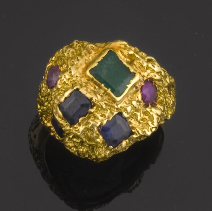 An 18ct gold ring. Set with two rubies, three sapphires and an emerald. Approximately 14g. Size R.