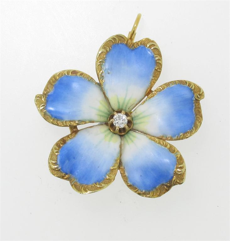 A diamond set gold flower head brooch. The petals with blue enamel decoration and centred with a circular cut diamond. Folding pendant loop. 3cm wide. Fitted case.