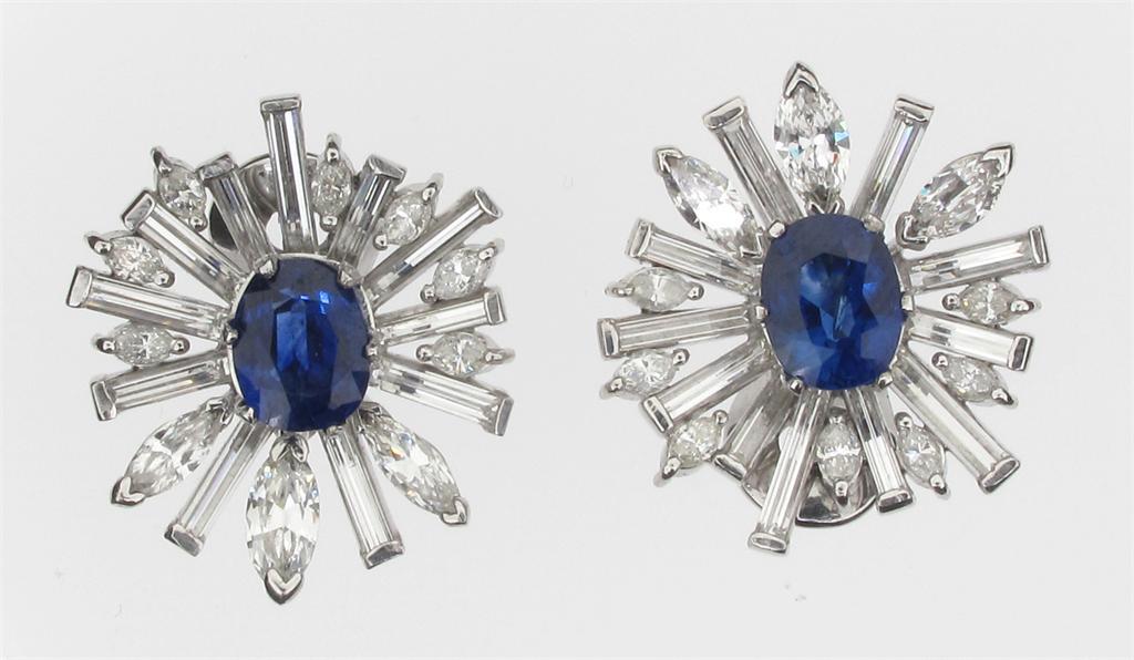 A pair of sapphire and diamond cluster earrings. The oval shaped sapphires are set within a surround of graduated baguette and marquise shaped diamonds in white gold and platinum. Both with indistinct inventory numbers.