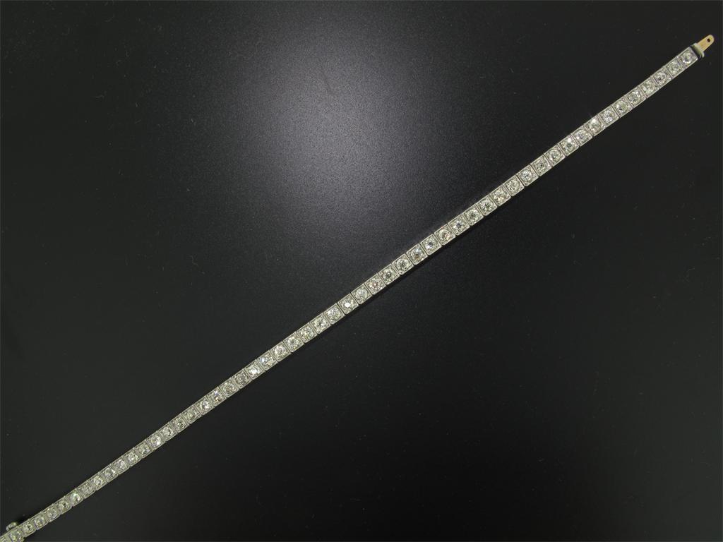 A diamond line bracelet. The old circular cut diamonds are set in white gold. 18cm long.