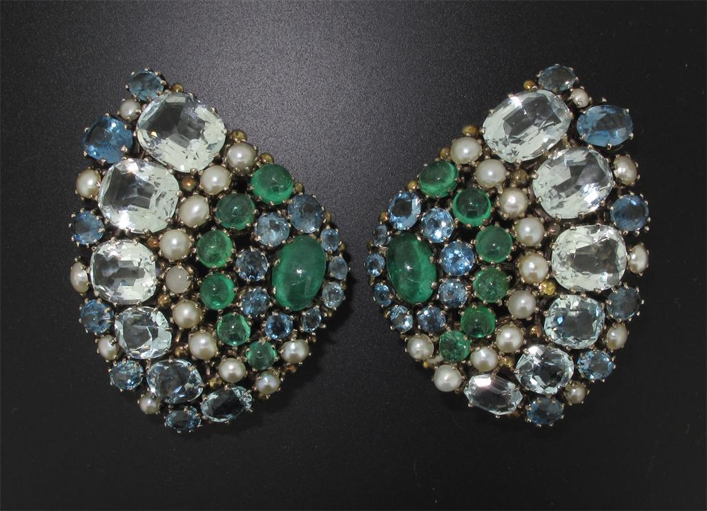 A pair of Arts and Crafts brooches in the style of Dorrie Nossiter. The fan shaped brooches are set with lines of cabochon emeralds, half pearls, and larger aquamarines in silver. One brooch missing catch. 4.5cm wide.