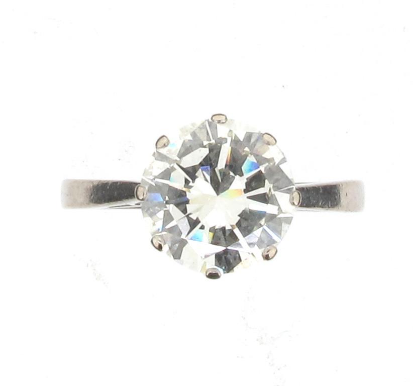 A diamond solitaire ring. The brilliant cut diamond is set in 18ct white gold (London marks) and weighs 2.70 carats (known weight). size O.