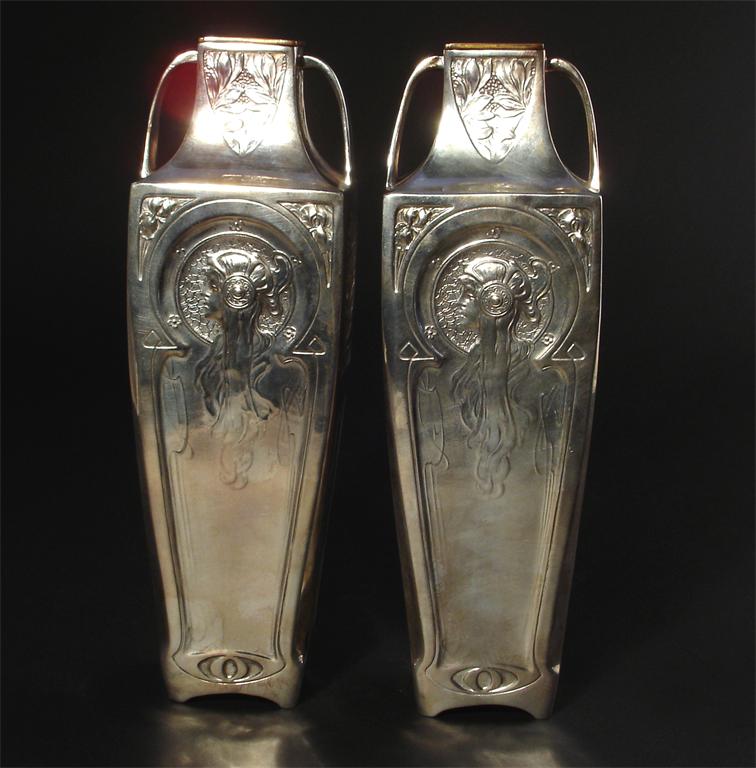 A pair of W.M.F electroplated vases twin-handled form, each cast in low relief with Mucha style portrait roundels, with brass liners stamped marks 25cm. high