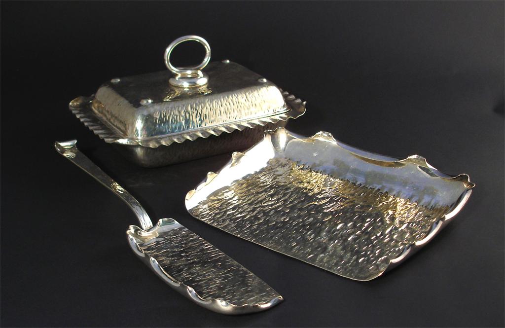 A Hukin & Heath electroplated crumb slice and tray model no.4414, hammered ripple finish, a tureen and cover similar model no.9296 and a small pair of plated sugar tongs stamped marks tray 24cm. wide