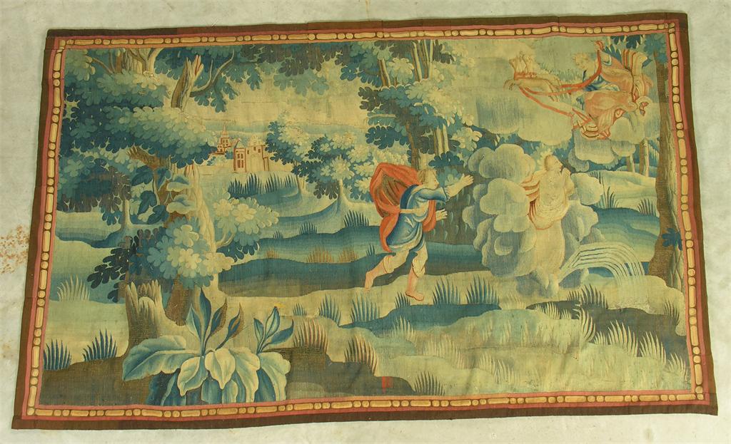 A Flemish tapestry fragment, late 17th / early 18th century depicting a mythological scene in a wooded landscape, with Diana in her chariot above two figures and a town in the distance, 63 x 100in (160 x 254cm).