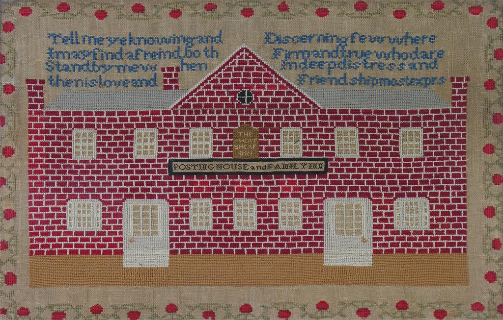 A Victorian woolwork picture, of 'The Wheatsheaf Inn; Posting House and Family Inn,' with verse above, to a floral border, 17.5 x 27in (44.5 x 68.6cm).
