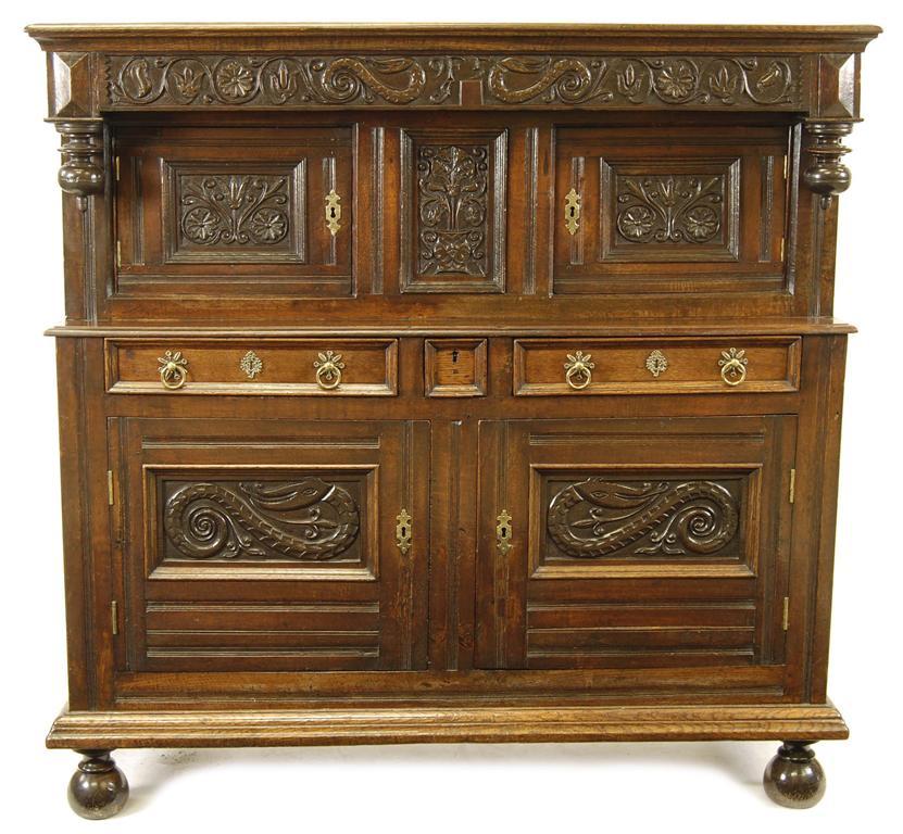 A Welsh oak press cupboard, the moulded cornice above a carved frieze decorated with scrolling flowers and dragons with initials and date 'F J 95', with turned pendants to a pair of cupboard doors carved with flowers flanking a central panel with an urn and flowers, above three frieze drawers and a pair of cupboard doors inset panels of dragons, on bun feet, late 17th century and later, 60.25in (153cm) h, 61.5in (156.2cm) w, 19.75in (50.2cm) d. Restoration and replacements, metal work later, feet later, possibly the base of a tridarn.