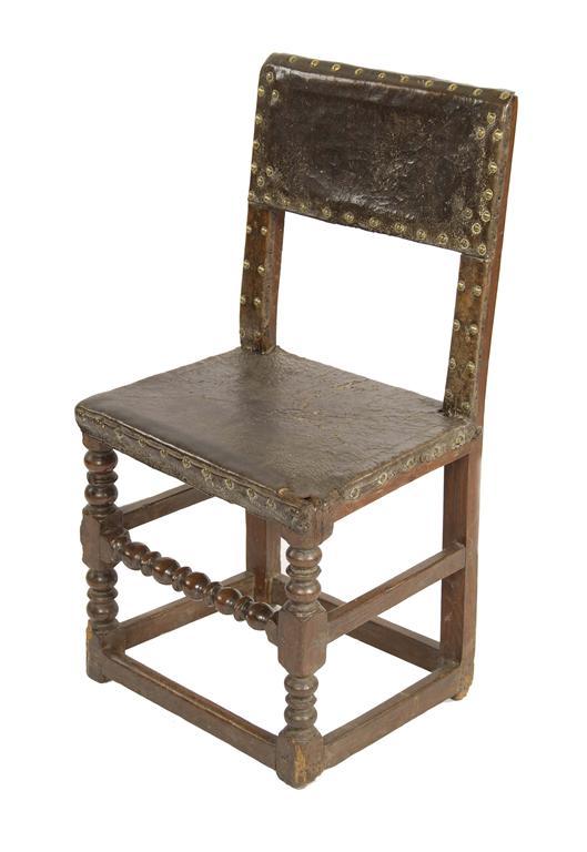A Charles II joined oak backstool, the brass studded leather back and seat on block, bobbin and ring turned supports, united by peripheral stretchers. Old worm, wear, seat repaired with evidence of straw under.