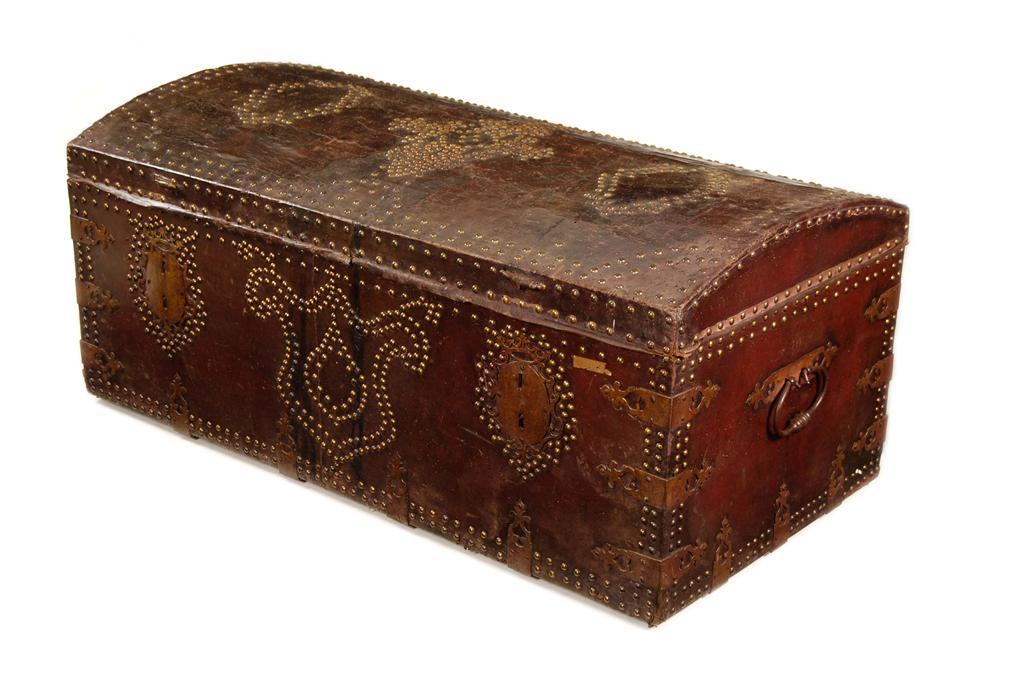 An 18th century leather and brass studded domed trunk, with iron carrying handles and a later fabric lined interior, 22.5in (57cm) h, 51.5in (130.6cm) w, 26.5in (67.1cm) d. Wormed, losses to leather.
