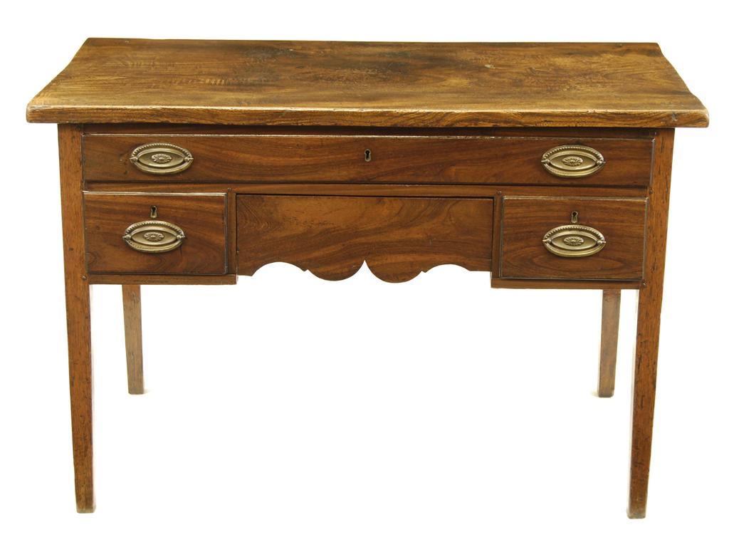 An early 19th century elm and fruitwood side table, the single plank top above a long frieze drawer and two short drawers flanking a shaped apron which has been later converted into a drawer, on square tapering legs, 30.5in (77.5cm) h, 46in (116.5cm) w, 24.75in (62.6cm) d.