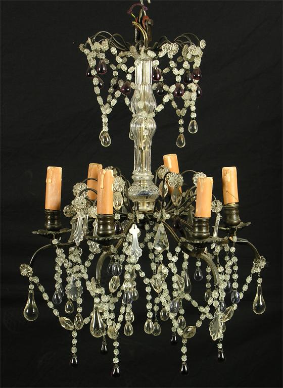 A French brass and moulded glass electrolier, with amethyst and clear glass drops, the six scroll branches with electric fittings, to a knopped stem, 25in (63.5cm) h, 16in (40.6cm) w.