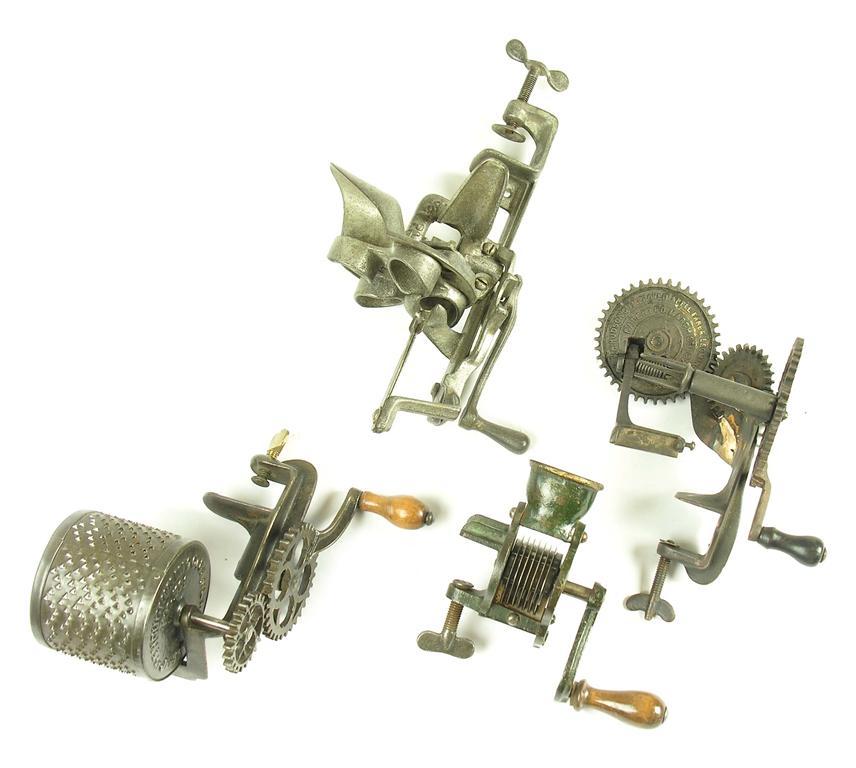 Kitchenalia: a 'Champion Seeder', cast Pat. Pend. New Std. Corp Mt. Joy Pa, with table clamp; a peeler; a grater Houchin Mfg Co; and a mincer. (4)