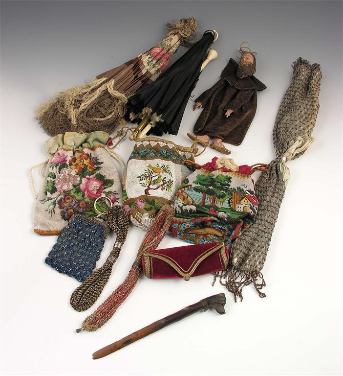 A Victorian silk and ivory parasol, 24in (61cm) h, another with a cream painted handle, three woven and steel Miser's purses, a velvet and wirework oblong purse with floral decoration, two European beadwork bags decorated landscapes, another with a floral spray and fabric back, a Regency silver mounted purse with a woven trellis design and cut steel beads hallmarked Birmingham 1817, beadwork and carved wood monk doll and a treen paper knife with dog head terminal. (12)