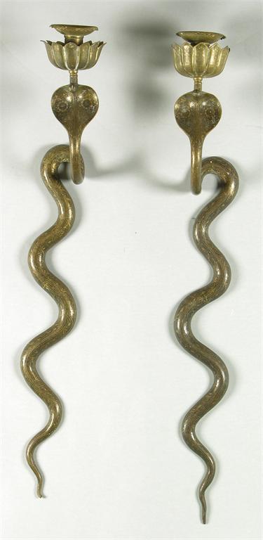 A pair of Indian brass and engraved lacquer serpent single wall lights