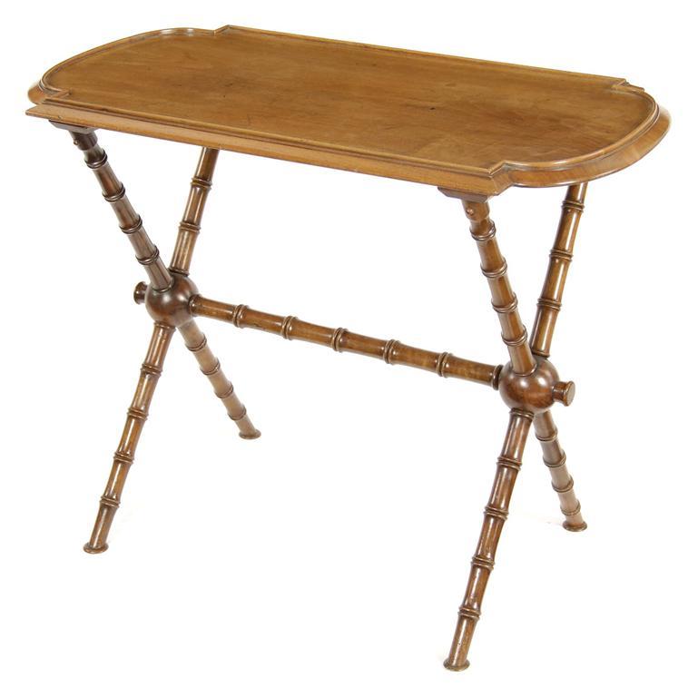 Howard & Sons. A late Victorian walnut occasional table, the shaped top with a beaded edge on simulated bamboo 'X' shape supports, the underside with a paper label inscribed 'EASY CHAIR & SOFA FACTORY, HOWARD & SONS, Upholsterers, 26 & 27 Berners Street, LONDON Patent Dining Tables' and numbered '7521, 734', 28.5in (72.3cm) h, 36in (91.5cm) w, 20in (51cm) d. Old worm holes to supports.