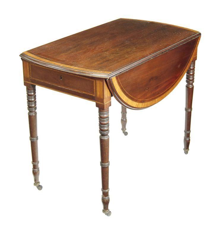 A mahogany Pembroke table, with satinwood banding and stringing having an oblong twin flap top, above a frieze drawer, early 19th century with later banding and stringing to the reshaped top, 27.5in (70cm) h, 19.75in (50cm) w closed, 33.5in (85cm) d.