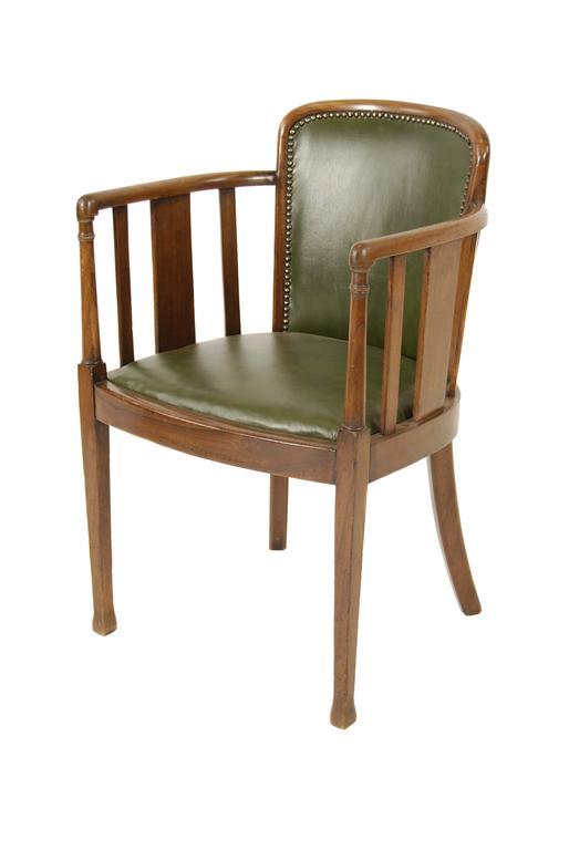 An early 20th century mahogany desk chair, with a green leather padded back and drop-in seat.