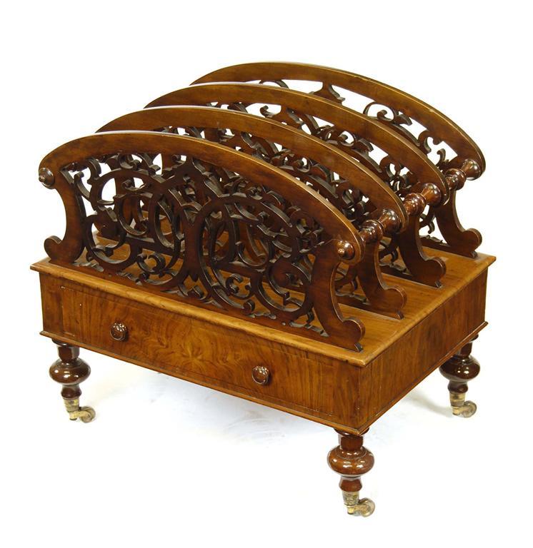 A Victorian walnut Canterbury, with four pierced fret work divisions above a frieze drawer, fitted replaced handles and on brass castors, 19.25in (48.8cm) h, 20.75in (52.5cm) w, 14.5in (36.8cm) d. Restoration.