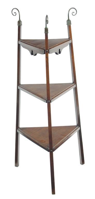 Marine Interest. A late Victorian walnut triangular three tier etagere, with scrolling brass finials, the underside with stencil mark inscribed 'REGD, NO 451004, The Alexandra', 40in (101.4cm) h, 17in (43cm) w and d.