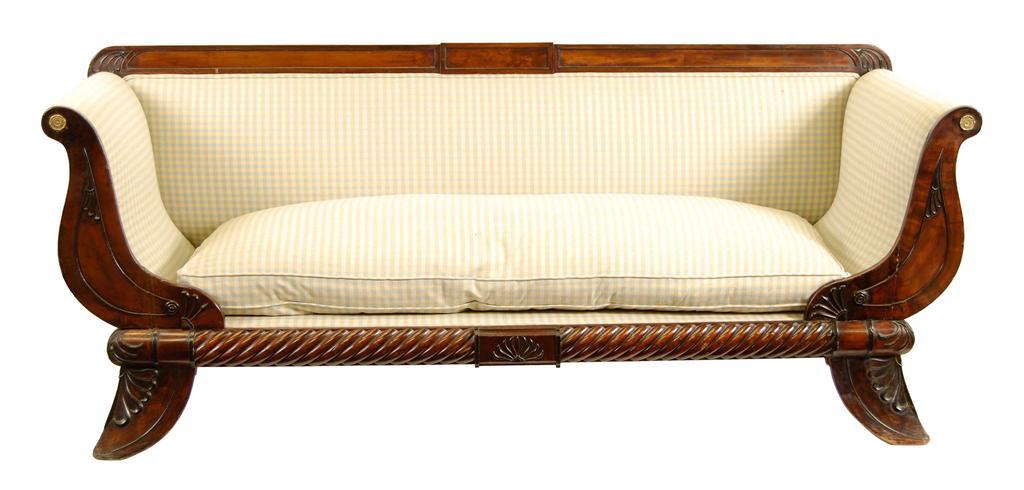 A 19th century mahogany sofa in Grecian revival style, decorated with anthemion motifs, the panelled tablet back above scroll arms, a rope twist frieze and on acroterion feet, with later gilt brass paterae, 33.5in (85cm) h, 85in (216cm) w, 32.5in (82.5cm) d.