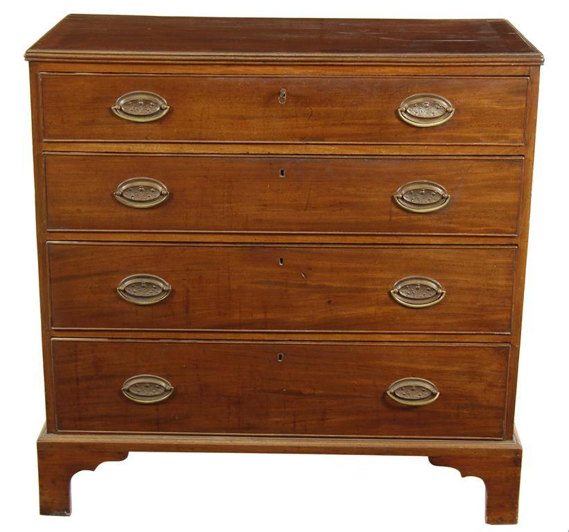 An early 19th century mahogany chest, the crossbanded and reeded edge top above four long graduated drawers, 37in (94cm) h, 37.5in (94.8cm), 16.75in (42.4cm) d. With key.