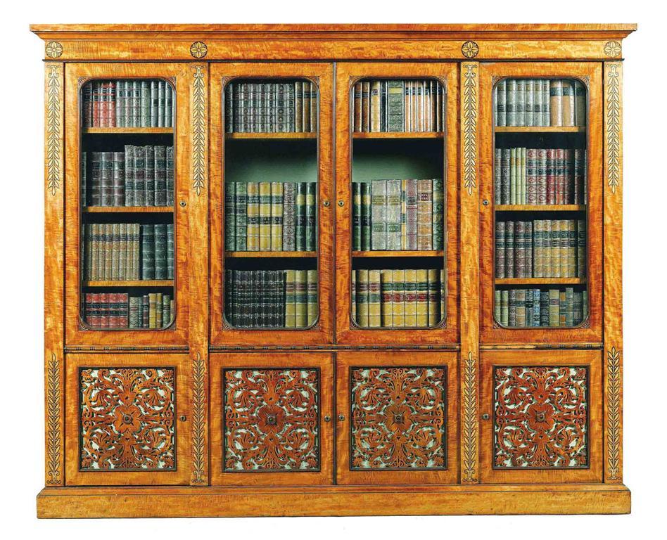 A William IV satinwood and marquetry bookcase, inlaid with bird's eye maple flower heads and stylized acanthus, the detachable cornice above three sections, the centre with a pair of glazed doors, flanked by single doors, enclosing adjustable shelves to cupboards below with foliate fret panelled doors, on a plinth base, 71.5in (181.5cm) h, 87.75in (222.8cm) w, 15.75in (40cm) d. One door lacking glass, damages to mouldings.