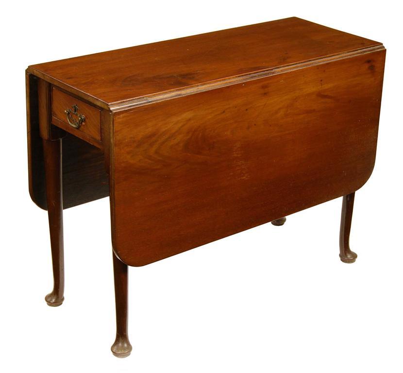 A mahogany drop-leaf table, the twin-flap top above a frieze drawer and on turned legs and pad feet, mid 18th century and later, 27.75in (70cm) h, 37.5 x 47.5in (95.3 x 120.7cm) open.