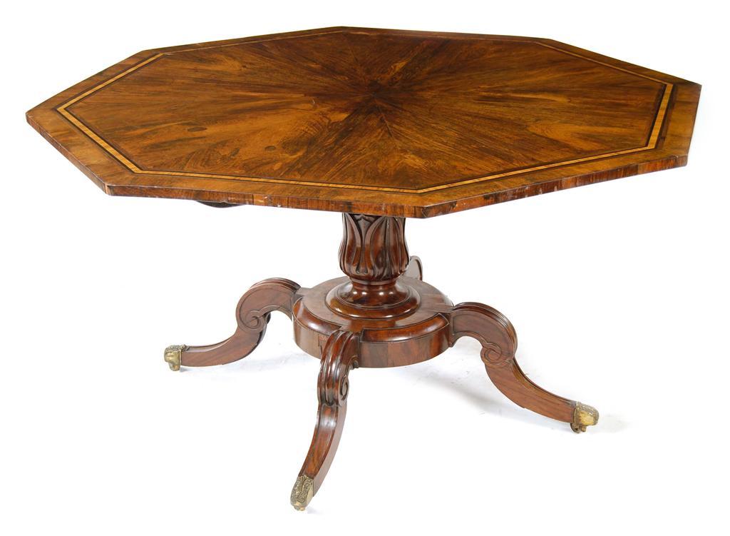 A George IV rosewood breakfast table, the octagonal tilt-top with segmented veneers and banded with satinwood and purple heart, the goncalo alves base with a leaf carved stem and four moulded scroll supports terminating in foliate cast brass caps and castors, stamped 'I R', 28.25in (71.7cm) h, 55.25in (140.3cm) w. Block and bearers are later replacements, old breaks and repairs to legs.