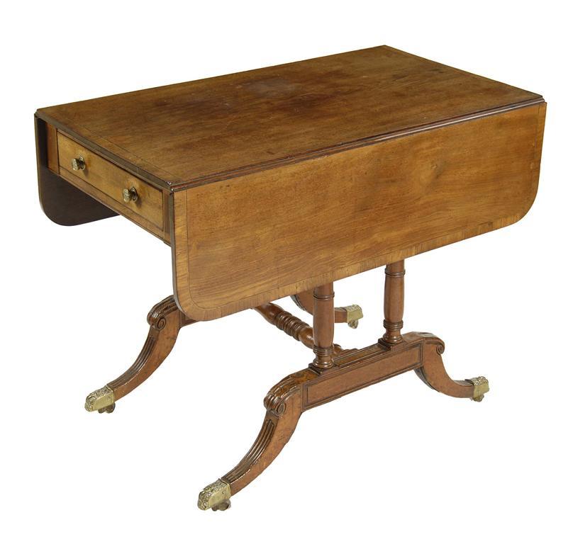 A Regency mahogany supper table, inlaid stringing, the drop-leaf top crossbanded in rosewood above a frieze drawer, faux to the reverse, on turned pillar supports and reeded downswept legs terminating in foliate cast brass sabots and castors, 28.5in (72cm) h, 36 x 40.5in (91 x 102.5cm) open. Restoration.