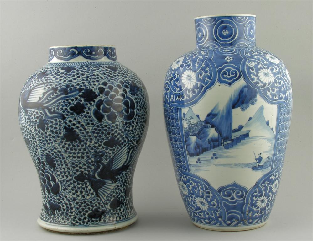 A Chinese blue and white vase, of ovoid form decorated a river landscape and chrysanthemum, Kangxi, 15in (38cm) h, cracked and with a filled drill hole, and a baluster vase decorated chrysanthemum and phoenix, 13.25in (33.6cm) h. (2)