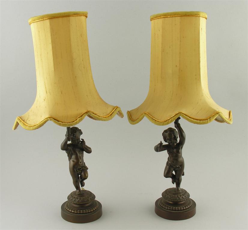 A pair of bronze putto table lamps