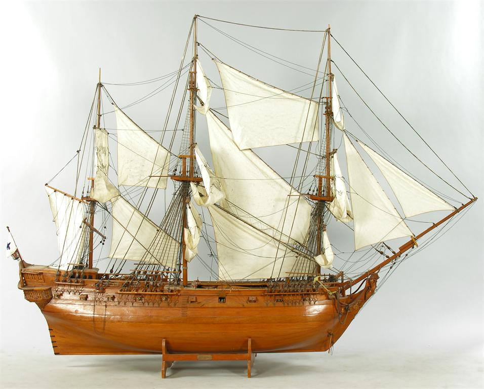 A large stained wood model galleon, 61in (155cm) h, 82in (208.3cm) l, the stand with a brass plaque 'St. Geran, 1744'.