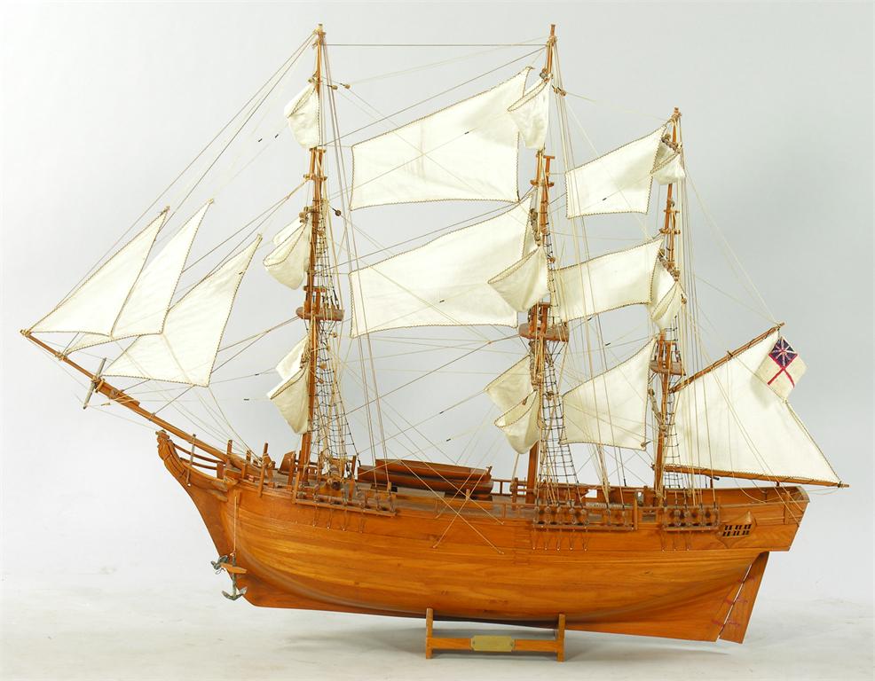 A carved wood model galleon, the stand with a brass plaque inscribed 'BOUNTY 1787', 37in (94cm) h, 48in (122cm) l.