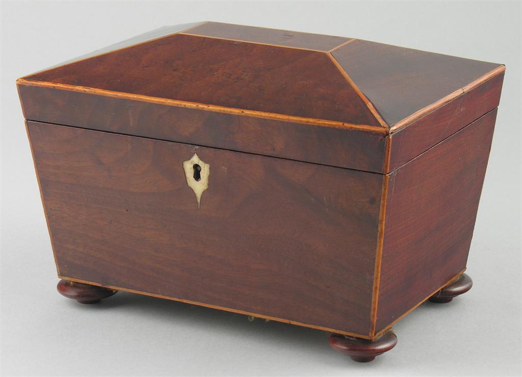 An early 19th century mahogany tea caddy, of sarcophagus shape with boxwood stringing, the hinged cover to a pair of lidded compartments with turned bone handles, to a shaped escutcheon on turned disc feet, 6in (15cm) h, 8.5in (21.5cm) w, 6in (15cm) d.