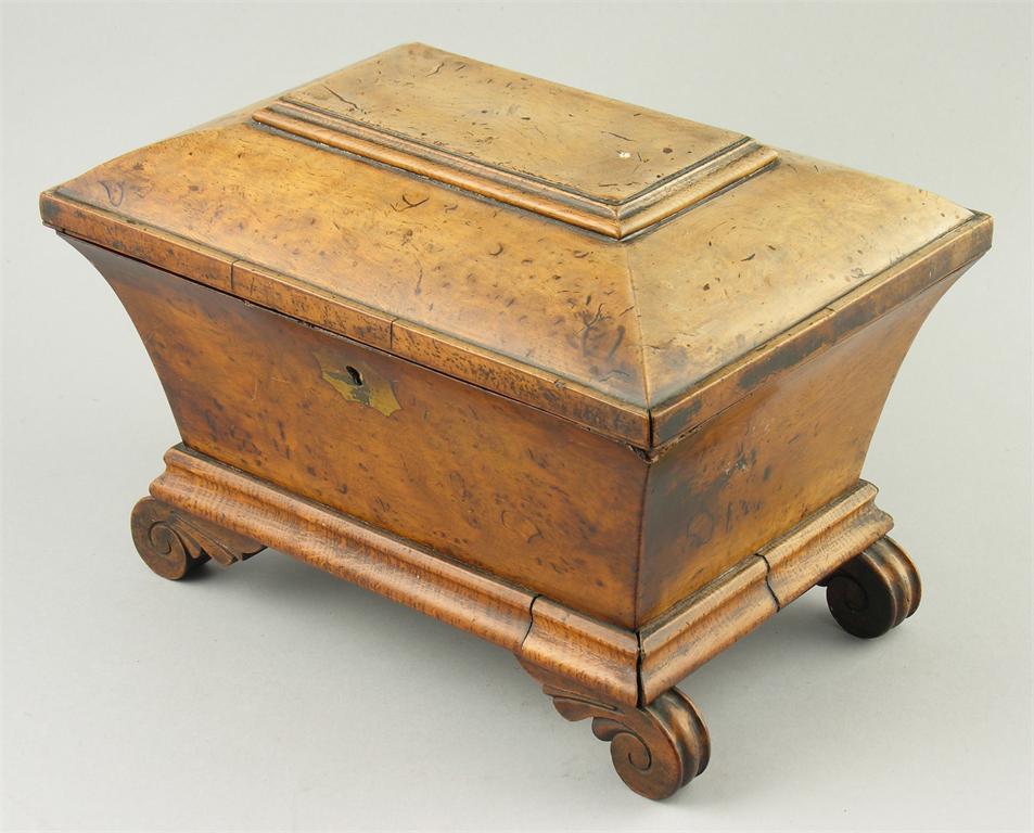 A William IV pollarded oak sarcophagus shape tea caddy, the hinged cover to a pair of hinged lid canisters, on carved scroll feet, 8in (20.3cm) h, 11.25in (28.5cm) w, 8in (20.3cm) d. Top and back faded.