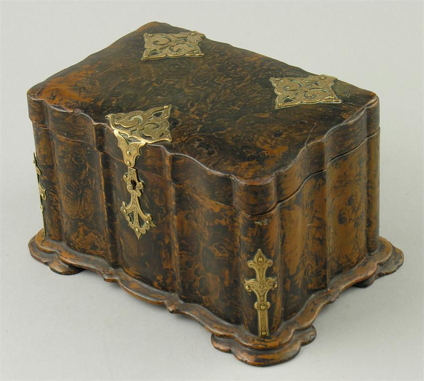 A Victorian papier-mch and simulated tea caddy, with engraved brass mounts and a twin lidded interior, 5in (12.8cm h, 8.5in (21.5cm) w, 6in (15.2cm) d. min