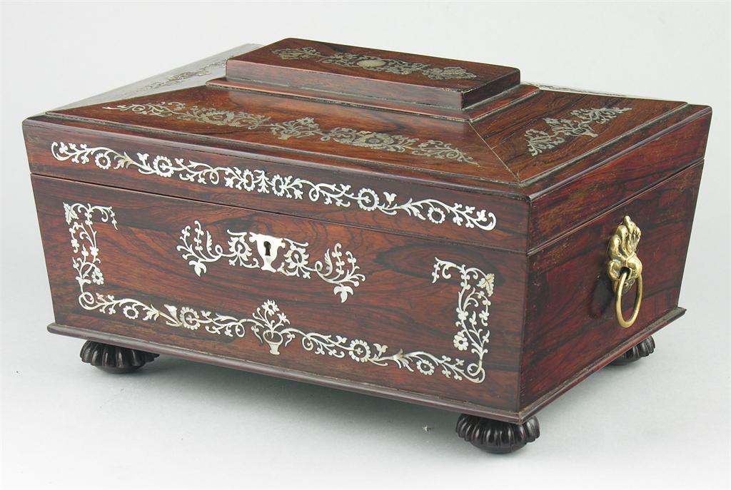 An early Victorian rosewood and mother-of-pearl inlaid work box, of sarcophagus shape, the later interior with a lift-out tray, the sides with replaced brass handles on ribbed mushroom feet, 6.75in (17cm) h, 12in (30.5cm) w, 9in (23cm) d.
