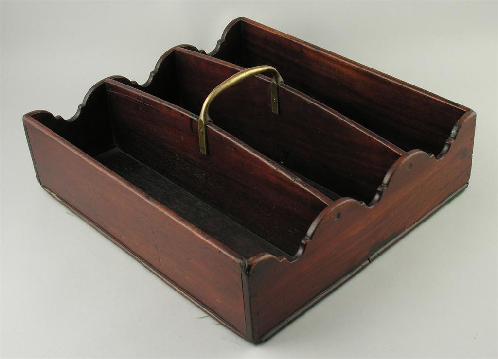 A George III mahogany cutlery tray, the three divisions to shaped ends and a central brass handle, 6.25in (16cm) h, 13.75 x 15in (35 x 38cm).