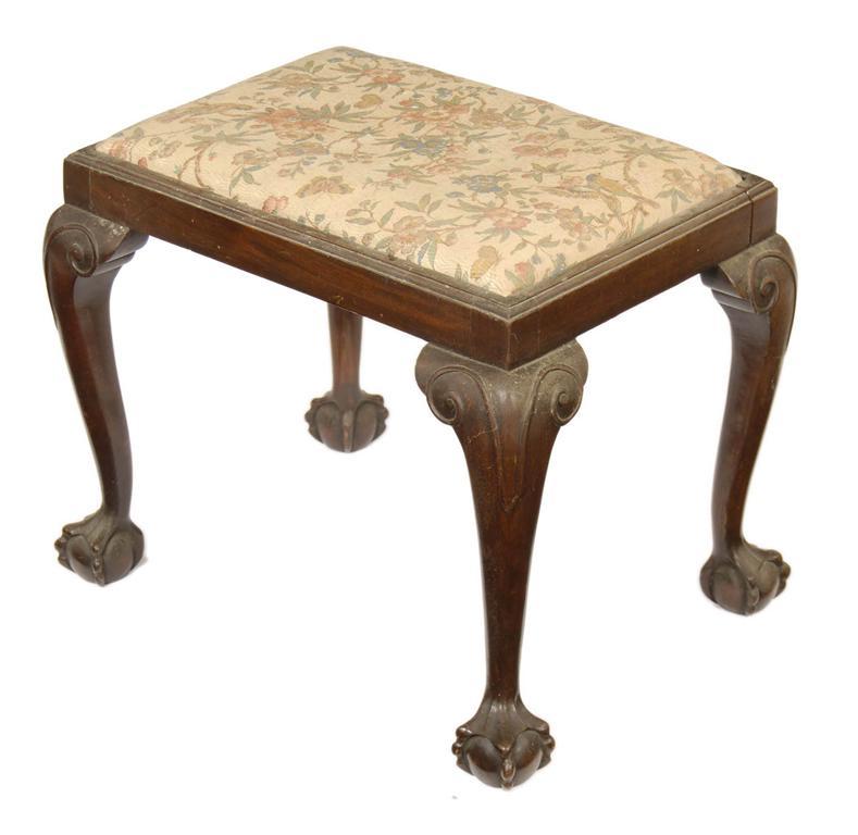 A mahogany stool in mid 18th century style, with a drop-in seat on carved cabriole legs and claw and ball feet, 17.75in (45cm) h, 23.25in (59cm) w, 16.5in (42cm) d. Joints loose.