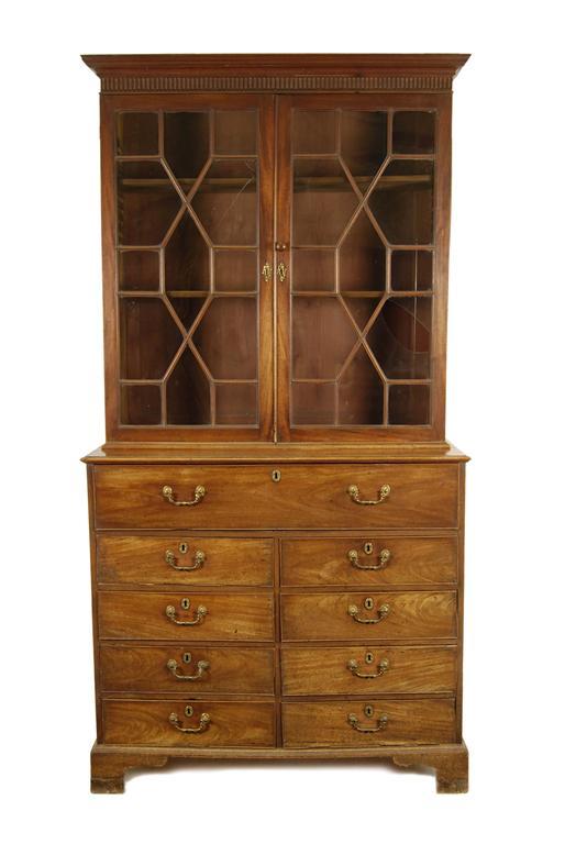 A George III mahogany bookcase cabinet, the moulded and fluted cornice above a pair of astragal glazed doors enclosing two adjustable shelves, the base with a long drawer above eight short drawers, on shaped bracket feet, 90.5in (230cm) h, 46.25in (117.5cm) w, 21.75in (55cm) d.