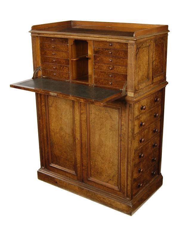 A Victorian burr walnut cabinet, the moulded edge top inset a hinged compartment and with a 3/4 gallery above a self locking leather lined fall, the interior with an arrangement of eleven plush lined drawers and a recess to house possibly a microscope, the base with two doors the left enclosing a shelf, the right side of the cabinet with six drawers and a locking bar, the left side with dummy drawers, to a plinth base, 48.5in (123.4cm) h, 34.75in (88cm) w, 19in (48cm) d.