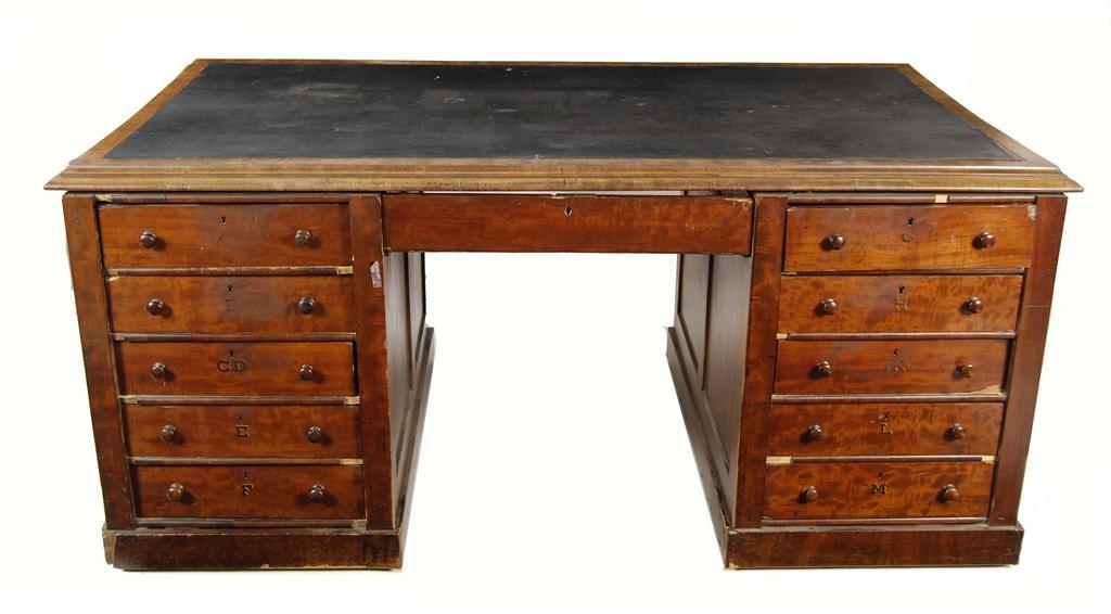 A mahogany twin pedestal partner's desk, the moulded edge top inset black leatherette, above a central frieze drawer and five lettered drawers to each pedestal, with corresponding drawers to the reverse, to a plinth base and castors, 19th century and later, 32.5in (82.4cm) h, 73.25in (186cm) w, 41in (104cm) d. In need of restoration.