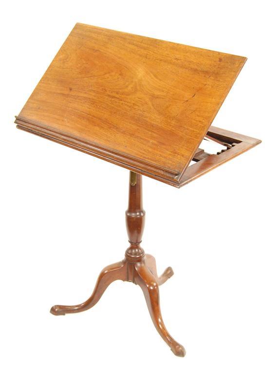 A late George III mahogany reading table, the hinged rectangular top with a moulded rest, to a ratchet and a pull-out candle slide, on an adjustable stem, cabriole legs and faceted pad feet, 29.5in (75cm) h, 26.5in (67.2cm) w, 19.75in (50cm) d. Old breaks and repairs to legs.