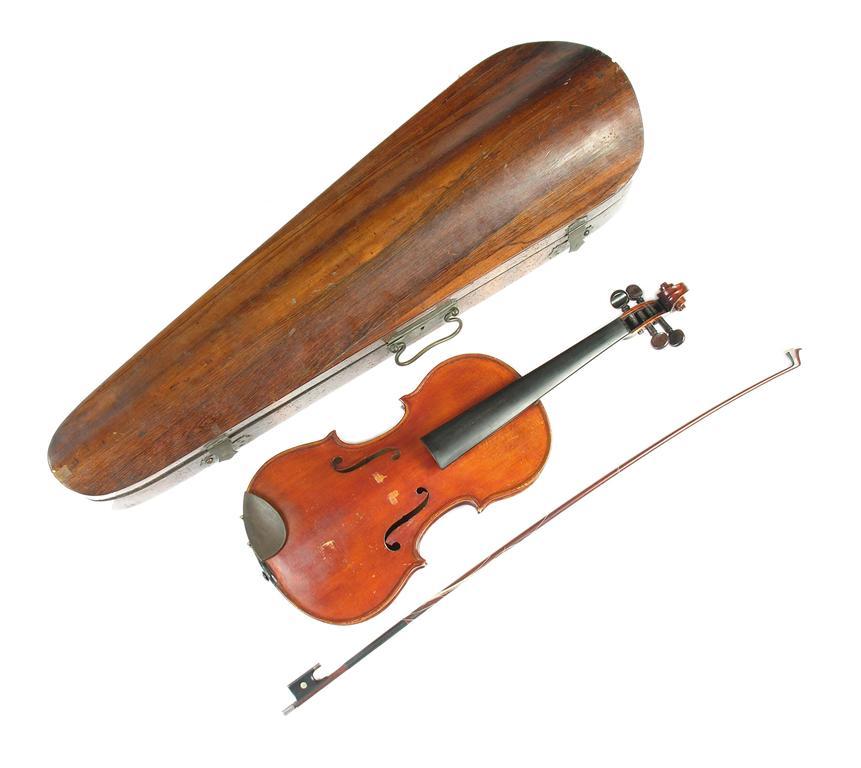 A violin, with a two piece back and inlaid stringing, the interior inscribed 'J. over S.A. 1907 Amber, no. III', strings and bridge missing, with a bow having an ebony fob with silver and mother of pearl mounts, in a rosewood coffin case.
