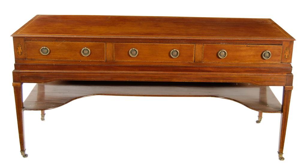 A mahogany three drawer sideboard, converted from an early 19th century square piano, 31.25in (79.2cm) h, 64.5in (164cm) w, 24in (61cm) d.