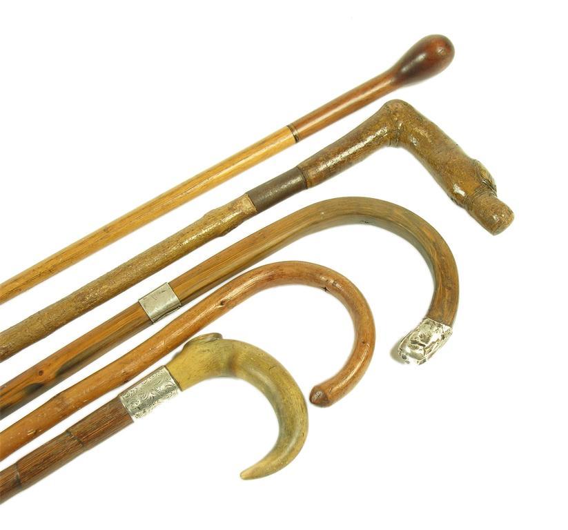 A late Victorian bamboo walking stick, with horn handle and silver ferule, 33in (84cm) h, a square section hardwood walking cane with silver mounts and three other canes. (5)