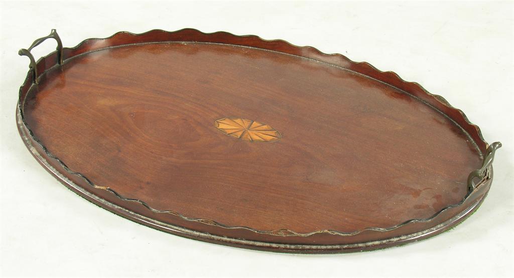 A 19th century oval mahogany drinks tray, centred a fan patera, to a wavy gallery and open brass handles, 28in (71cm) w, 19.75in (50cm) d.