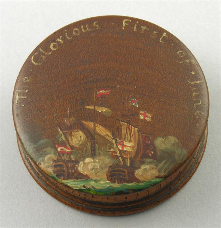 A turned oak box, the cover painted 'The Glorious First of June', 3in (7.8cm) dia. The Glorious First of June (also known as the Third Battle of Ushant and in French as the Bataille du 13 prairial an 2) was a naval battle fought in the Atlantic Ocean on June 1, 1794 between the Royal Navy and the navy of Revolutionary France. It was the first major naval battle of the French Revolutionary Wars.