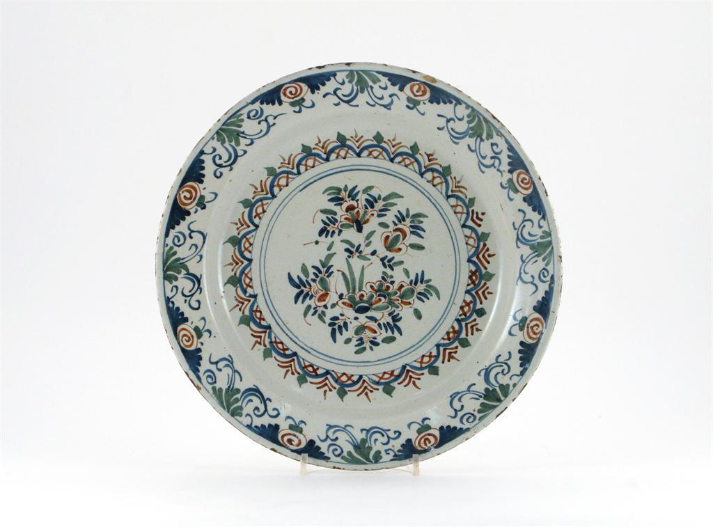 A large delftware plate, painted in blue, green and red with a central Oriental floral motif within bands of stylized foliage, 2nd half 18th century, small rim chips, 34.5cm.